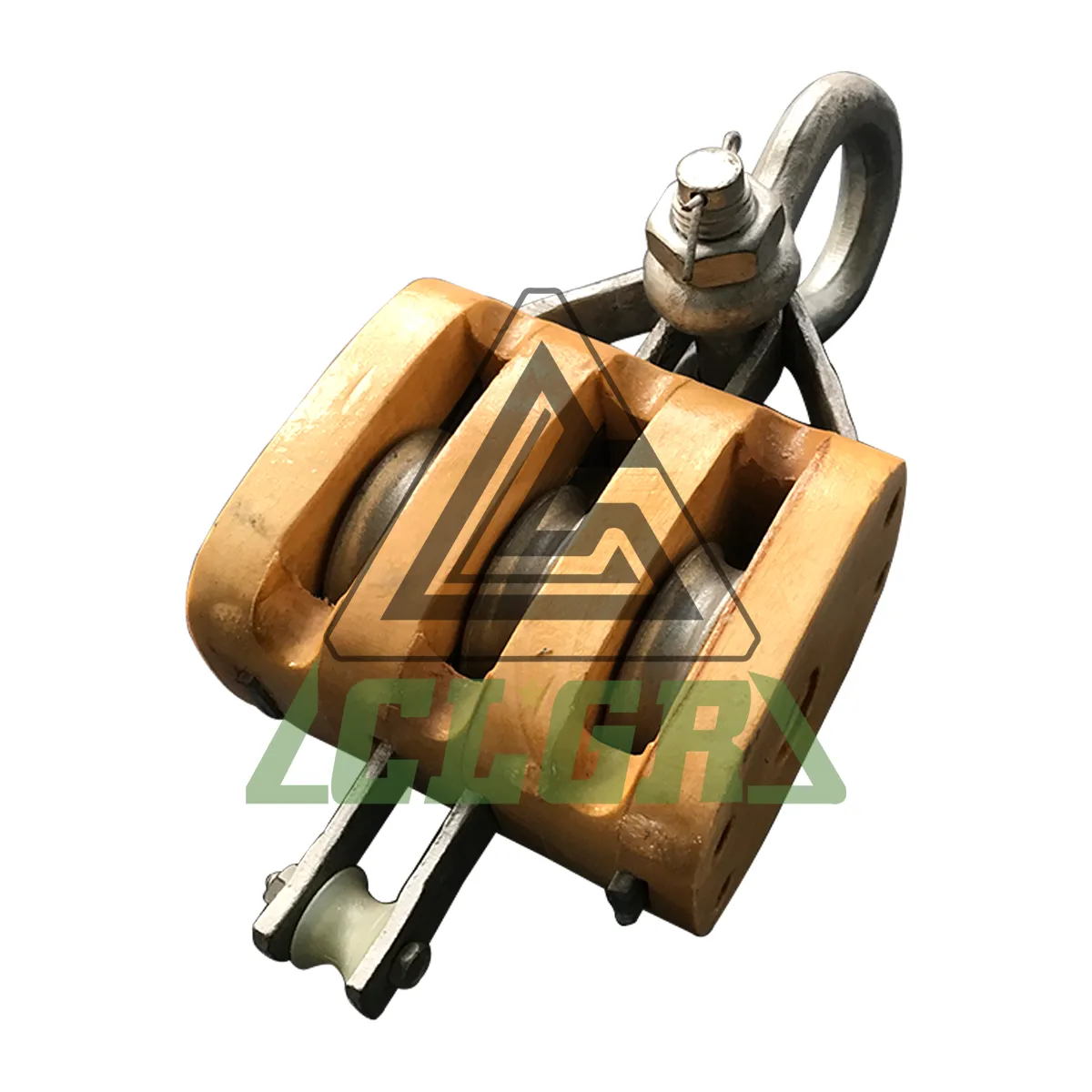 CLGR® Regular Wood Block with Shackle Triple Wheel/Sheave, also called Triple Wood Shell Block with Shackle, Regular Wood Shell Block Triple Sheave with anchor shackle and Wooden Pulley Block with Shackle.
